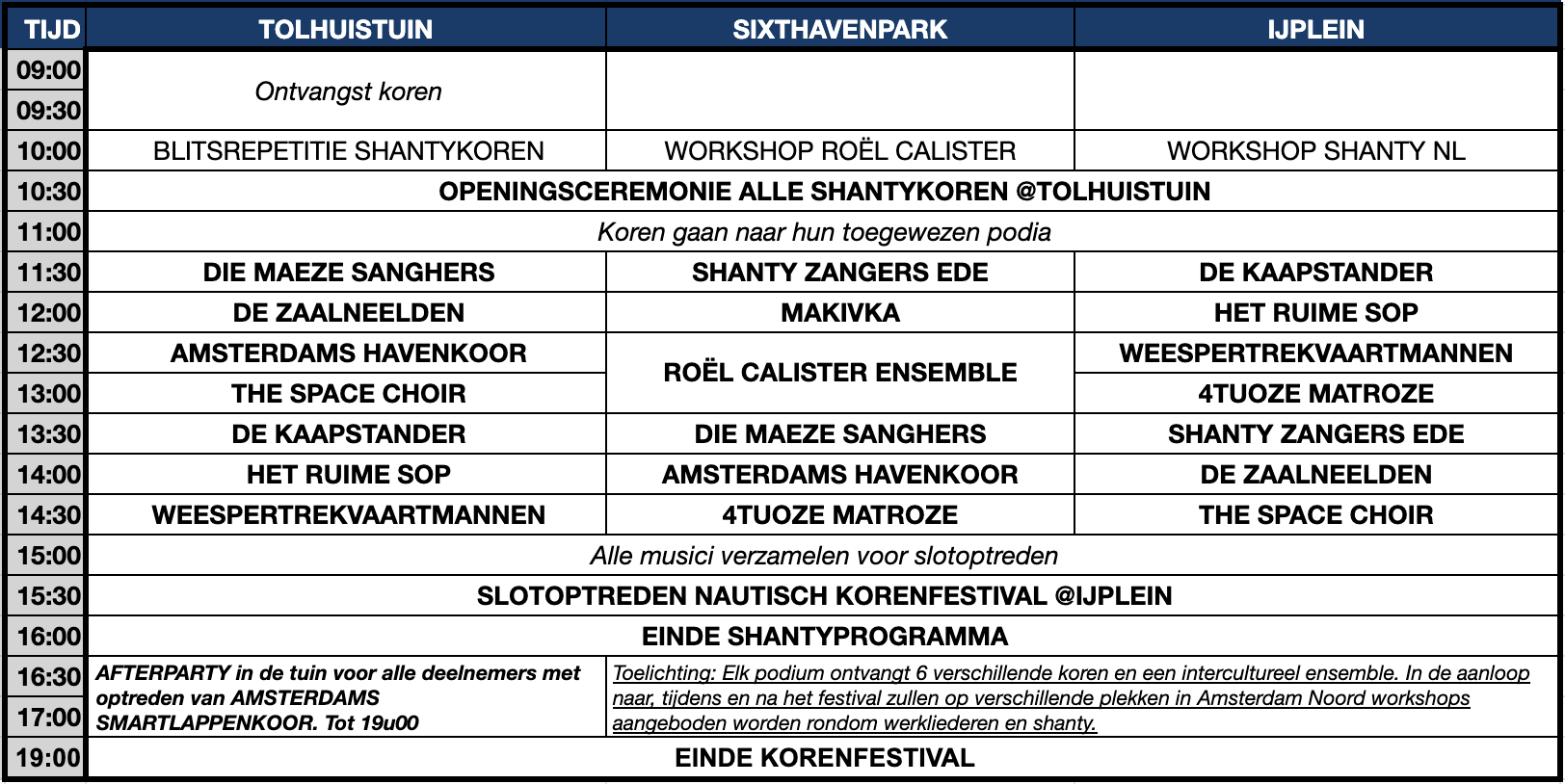Voor de 11e keer wordt dit festival gehouden op een half overdekt plein met veel zitplaatsen en gelegenheid om te eten en drinken. Vijf koren doen mee t.w. Het Schipperskoor, Shantykoor de Vechtse Parlevinkers, Shantykoor Het Ruime Sop, De Piraten meiden en organisator Shanty & zeemanskoor de Turfschippers. Aanvang 12.00 uur tot 18.00 uur. Toegang gratis. Bij slecht weer wordt uitgeweken naar de sporthal in CS de Boei.